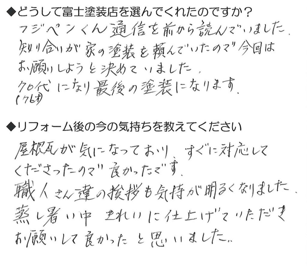 日立市 W様当店のチラシを見てご依頼いただきまして、ありがとうございます。外壁の塗装と一緒に、以前から気になっていたという屋根瓦のしっくいの補修もやらせていただきました。ありがとうございました。